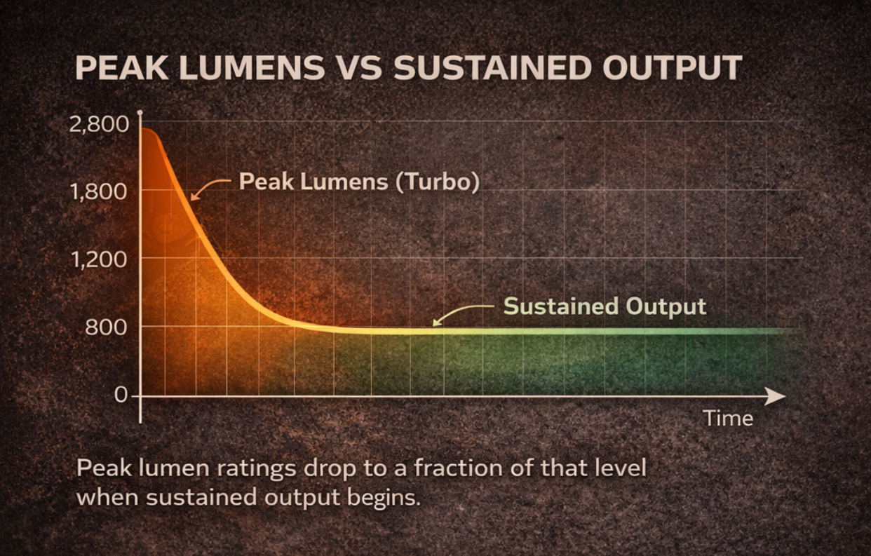 Sustained output, not peak lumens.