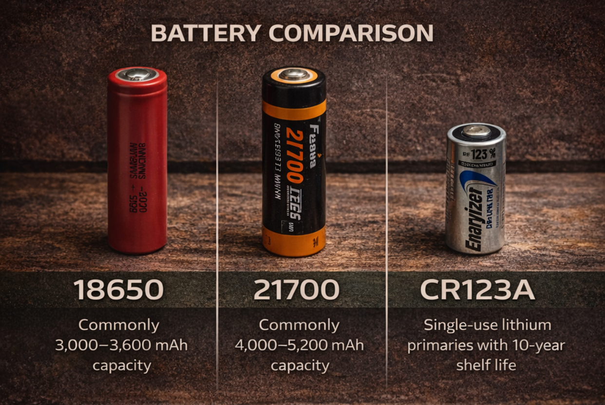 What battery type is best for a survival flashlight? It depends on your scenario. USB-C rechargeable 21700 is the most practical for everyday use and modern convenience. CR123A lithium primaries are better for cold weather, long-term storage without attention, and guaranteed availability in a post-disaster supply environment. The ideal setup: one rechargeable-primary light as your main, one CR123A-capable light as your backup.